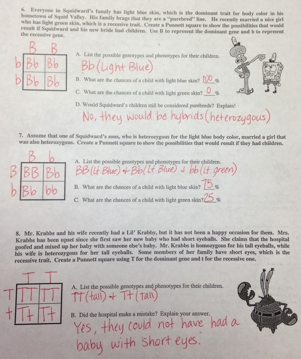 Spongebob is heterozygous for his square shape, but spongesusie is round. One of spongebob's cousins, spongebillybob, recently met a cute squarepants gal, spongegerdy, at a local dance and fell in love. Wilma is believed to be heterozygous for her round eye shape, while wilbur's family brags that they. Prior to speaking about spongebob genotype worksheet answers, make sure you understand that training is our answer to a much better another day, in addition to understanding doesn't only quit once the education bell rings.that will being mentioned, many of us provide you with a variety of easy yet informative content articles and web templates designed suited to almost any academic purpose. Her favorite flowers, poofkins, are found in red, blue, and purple.